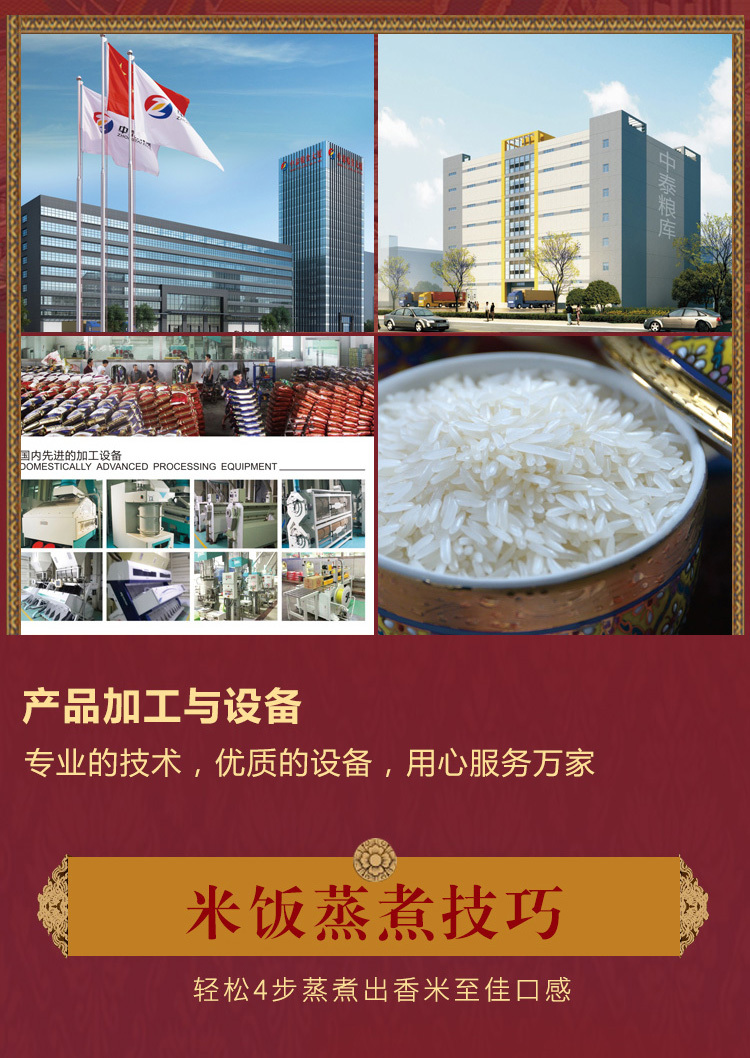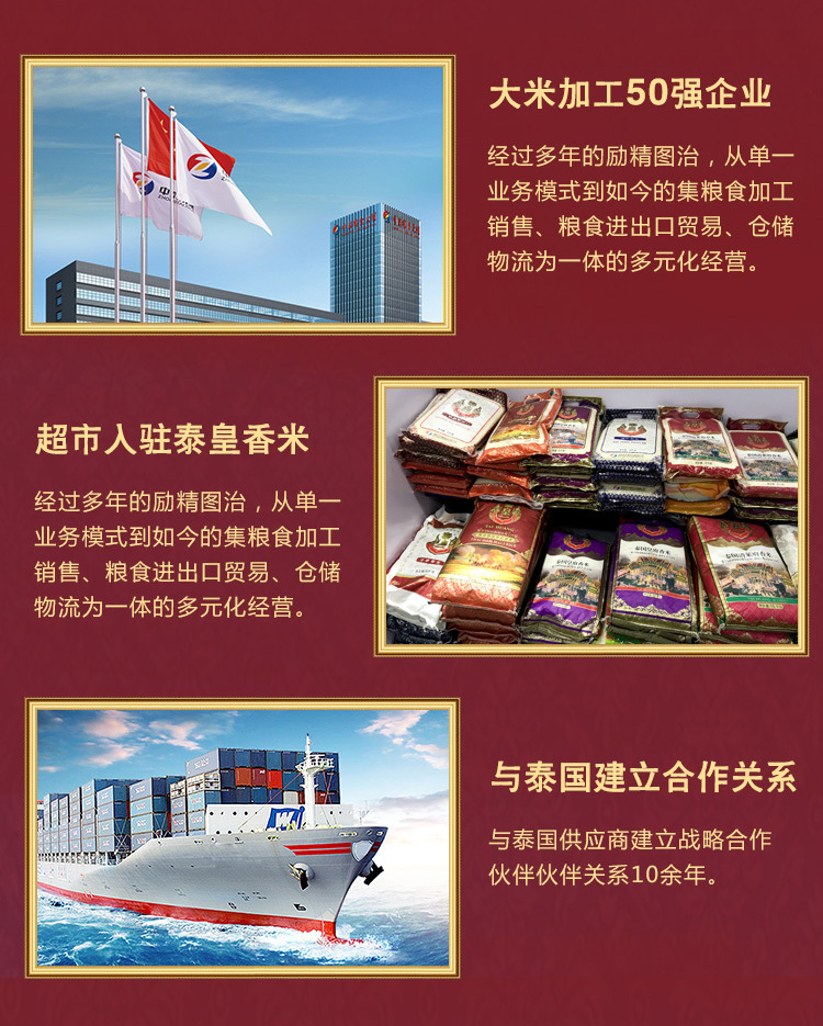 中泰米业是一家集粮食加工、销售、粮油进出口、贸易、仓储、物流为一体的民营企业。公司下辖七个部门、五个分子公司。引进全套瑞士布勒公司优质大米生产工艺和设备,现有大米年生产能力15万吨,仓储能力3万吨。公司主导产品"泰皇"牌系列大米远销北京、上海、重庆等30多个大中城市,建立了良好的物流和销售服务网络。