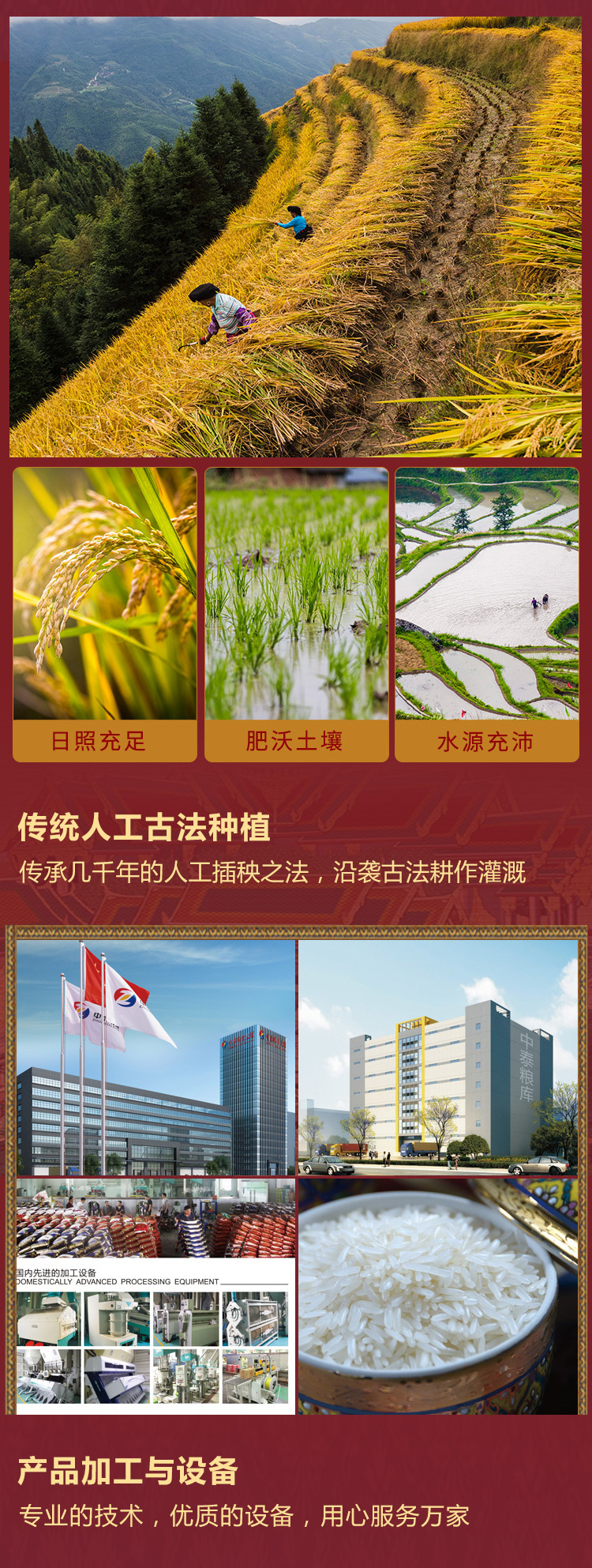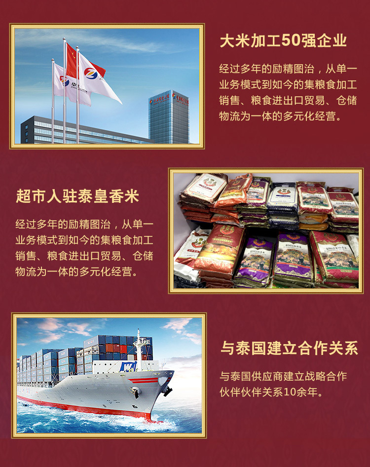 中泰米业是一家集粮食加工、销售、粮油进出口、贸易、仓储、物流为一体的民营企业。公司下辖七个部门、五个分子公司。引进全套瑞士布勒公司优质大米生产工艺和设备,现有大米年生产能力15万吨,仓储能力3万吨。公司主导产品"泰皇"牌系列大米远销北京、上海、重庆等30多个大中城市,建立了良好的物流和销售服务网络。