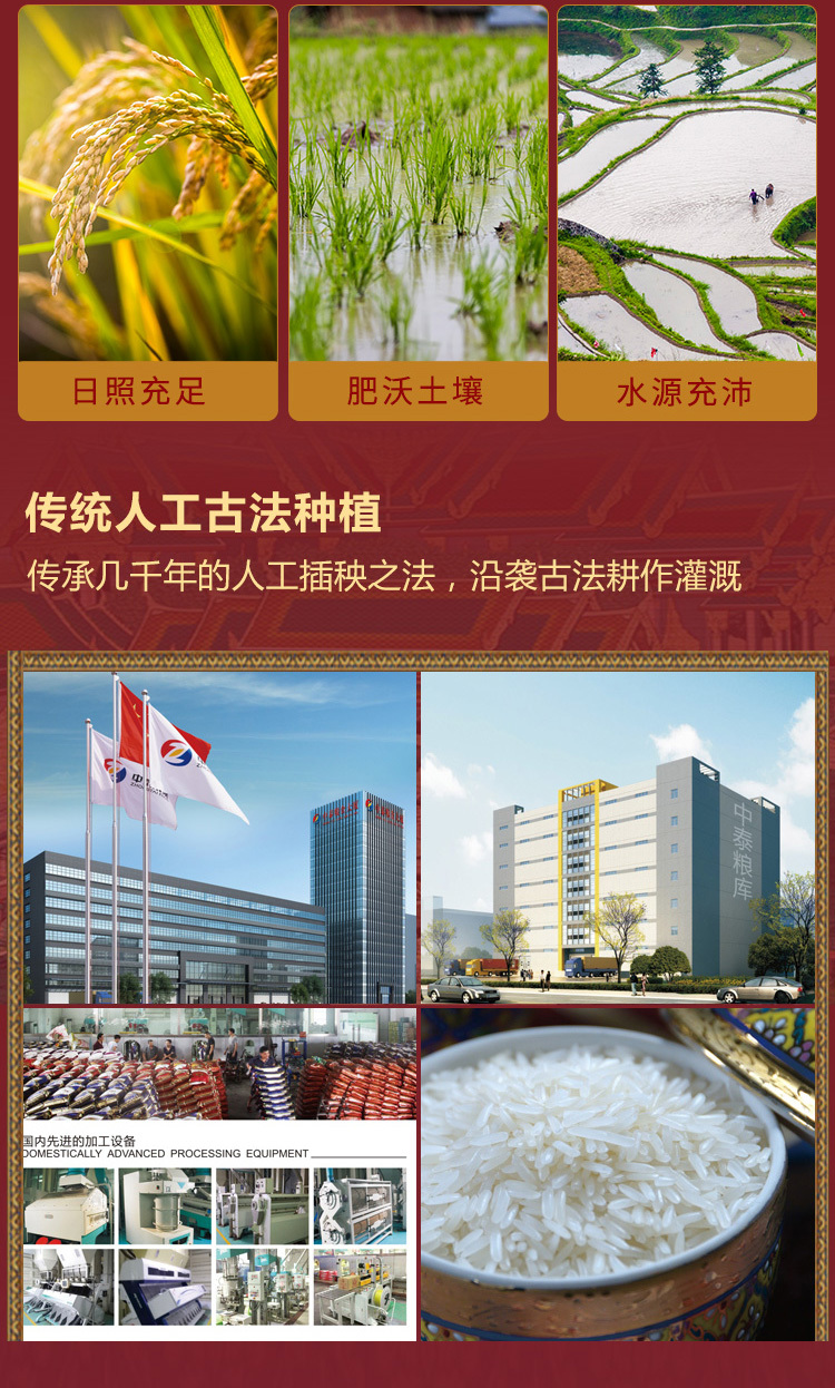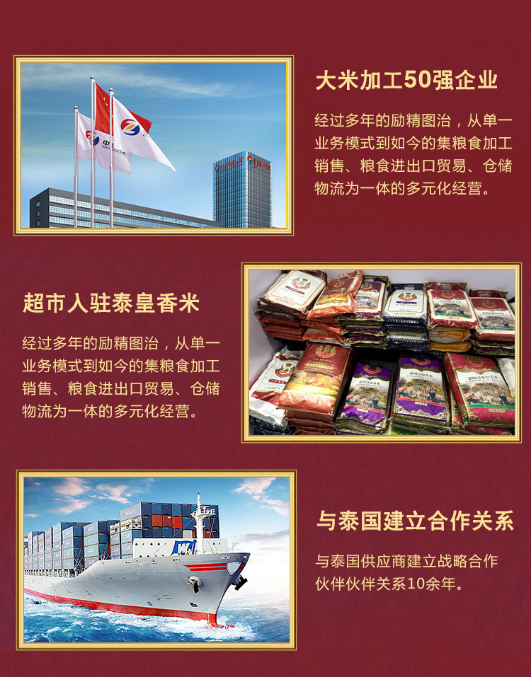 中泰米业是一家集粮食加工、销售、粮油进出口、贸易、仓储、物流为一体的民营企业。公司下辖七个部门、五个分子公司。引进全套瑞士布勒公司优质大米生产工艺和设备,现有大米年生产能力15万吨,仓储能力3万吨。公司主导产品"泰皇"牌系列大米远销北京、上海、重庆等30多个大中城市,建立了良好的物流和销售服务网络。